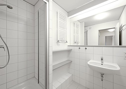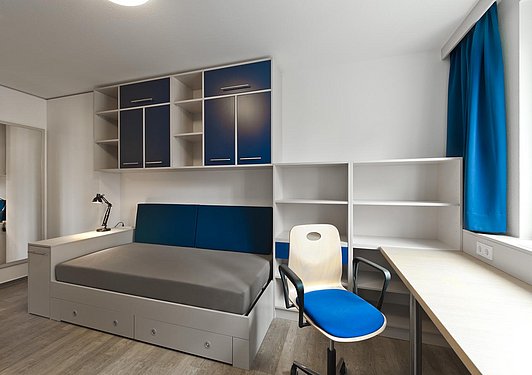 Preis inkl. Ausstattung: Kitchenette (inkl. Cerankochfeld, Dunstabzugshaube, Abfalltrenner, Kühlschrank mit Gefrierfach und Mikrowelle), eigenes Badezimmer mit Echtglasdusche, doppelseitige Matratze, Bett mit Bettkasten (100x200cm), Kleiderschrank, Bücherregale, Schreibtisch, Bürostuhl, Heizkörper, Vorhang, Kissen, Spiegel, Garderobe, W-LAN-Anschluss, Galerieschiene, TV-Anschluss und indirekte Belüftung.