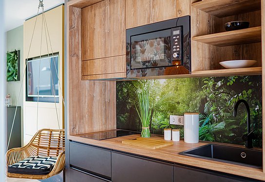 Das ca. 25 m² große Apartment Copacabana mit Küchenzeile bietet dir alles was du brauchst, egal wie lange du vor hast zu bleiben. Schon beim Öffnen der Tür lädt das brasilianische Flair direkt zum Wohlfühlen ein. Egal ob zum Entspannen im großen gemütlichen Bett während du deine Lieblingsserie schaust oder zum Arbeiten an deinem eigenen Schreibtisch - hier fühlst du dich gleich wie Zuhause. Ein modernes Bad inklusive Regendusche runden dein Apartment perfekt ab. Deine Küchenzeile beinhaltet: Spülmaschine, Mikrowelle mit Grillfunktion, 2er Cerankochfeld, Kühlschrank mit 3* Eisfach und alle wichtigen Utensilien wie Töpfe, Pfannen, Geschirr und vieles mehr.