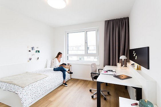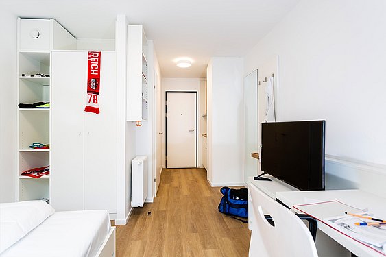 Preis inkl. Ausstattung mit Bett, Schreibtisch, Stuhl, Regalen, Kleiderschrank, Vorhängen, Deckenlampen, Küchenzeile mit Mikrowelle, Cerankochfeld, Dunstabzugshaube, Kühlschrank mit Gefrierfach, Spüle und Küchenschrank.