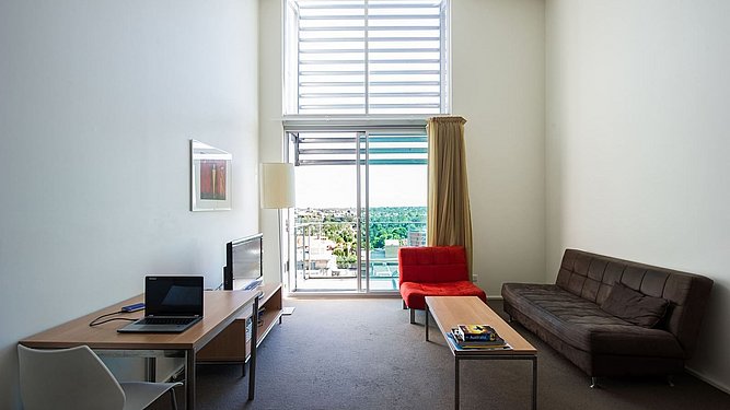 The bedroom features a queen bed, mirrored built in wardrobe, bed side tables and table lamps. The open plan living and dining area features a sofa, 32” TV, coffee table, dining room table and 2 chairs. There is also a large pin up board, study desk and swivel chair, perfect for students needing more space to study. Enjoy cooking in your own home with a fully equipped kitchen with modern appliances whilst looking out of your open balcony door feeling the cool breeze and taking in the breath-taking views of Adelaide.