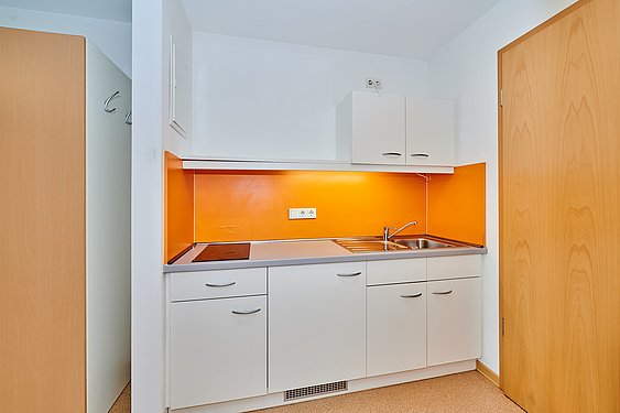 Ausgestattet mit: Küchenzeile Schreibtisch + Stuhl Schrank Bett inkl. Lattenrost eigene Nasszelle