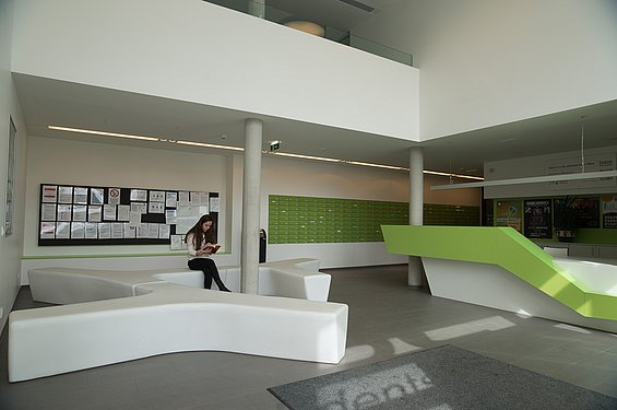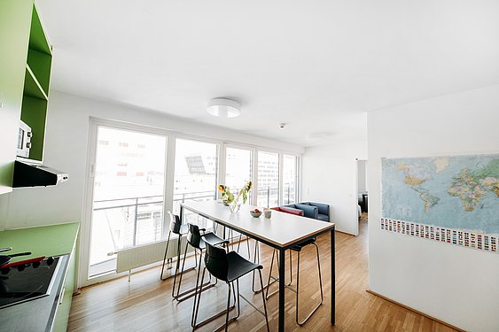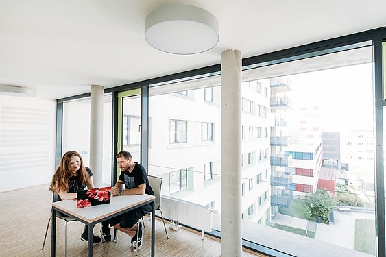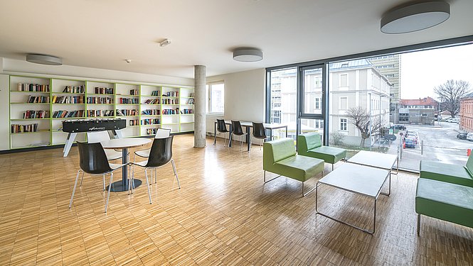 Ausstattung:* (ab 1.09.2021) – Heimleiter*in und Technikteam vor Ort – Cafeteria/Bibliothek (open Bookshelf) – Lernraum – Seminarraum – Fitnessraum Cardio/Kraft – Yogaraum/Tischtennisraum – TV-Raum – Snack- und Getränkeautomaten in Cafeteria – Printbox im Foyer (https://at.printbox.net/) – Empfangsboxen der österreichischen Post im Foyer – 2 Waschküchen (Waschen kostenpflichtig, Trocknen gratis) – große Dachterrasse/Dachgarten – Fahrradabstellraum – Parkplätze in Tiefgarage (gegen Gebühr – externer Anbieter) – Billa Plus im Haus *Änderungen vorbehalten