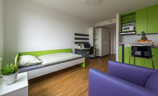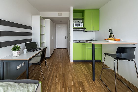 Ein Studio Apartment bietet dir ein modern möbliertes Apartment mit Wohn- und Schlafbereich, eine Kochnische und ein Bad mit WC und Dusche.